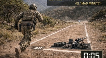El Mad Minute (Fase de Fuego): Al llegar a la réplica, el operador adopta posición (típicamente cuerpo a tierra), alimenta el rifle y debe realizar la mayor cantidad de disparos posibles sobre la placa de 75 metros.