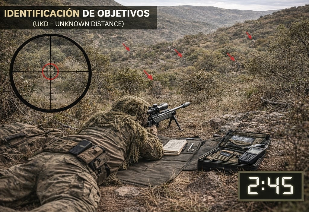 El Despliegue: El operador ingresa a la zona de tiro delimitada y adopta su posición (generalmente cuerpo a tierra). Se le indica el sector general (arco de visión) donde se encuentran ocultos los objetivos.