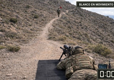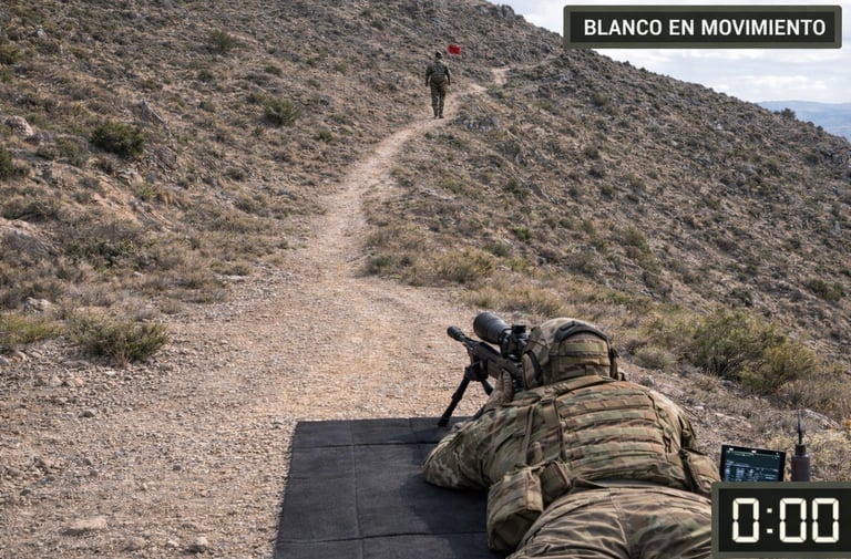 Prueba de anticipación y tracking. El operador debe calcular la velocidad del objetivo, establecer el "lead" (adelanto) y ejecutar el disparo sobre una silueta en movimiento.