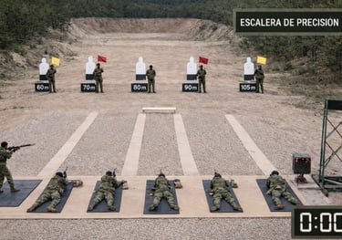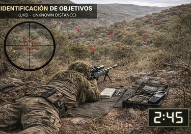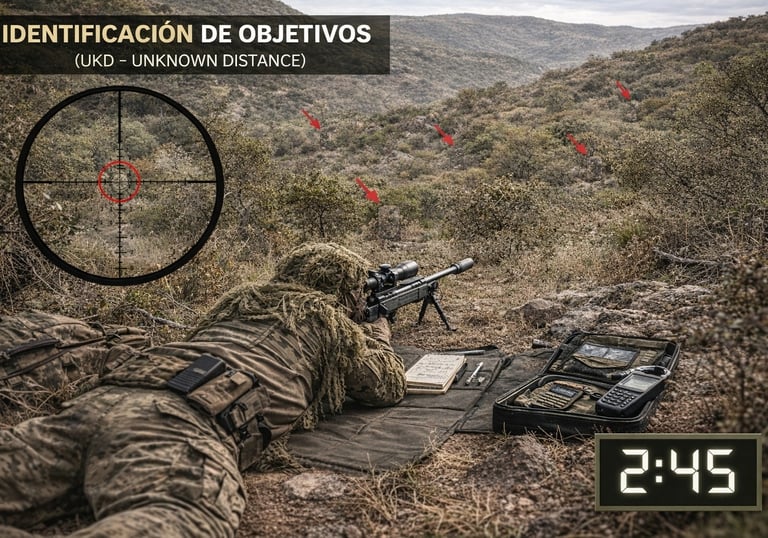 Localización de blancos mimetizados y cálculo de distancias (40m a 90m) usando exclusivamente la retícula (prohibido el uso de telémetros).